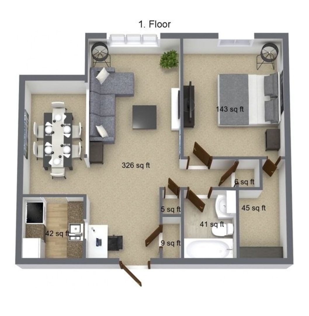 This apartment allows a little more room off the kitchen, larger living room, and a walk in closet.